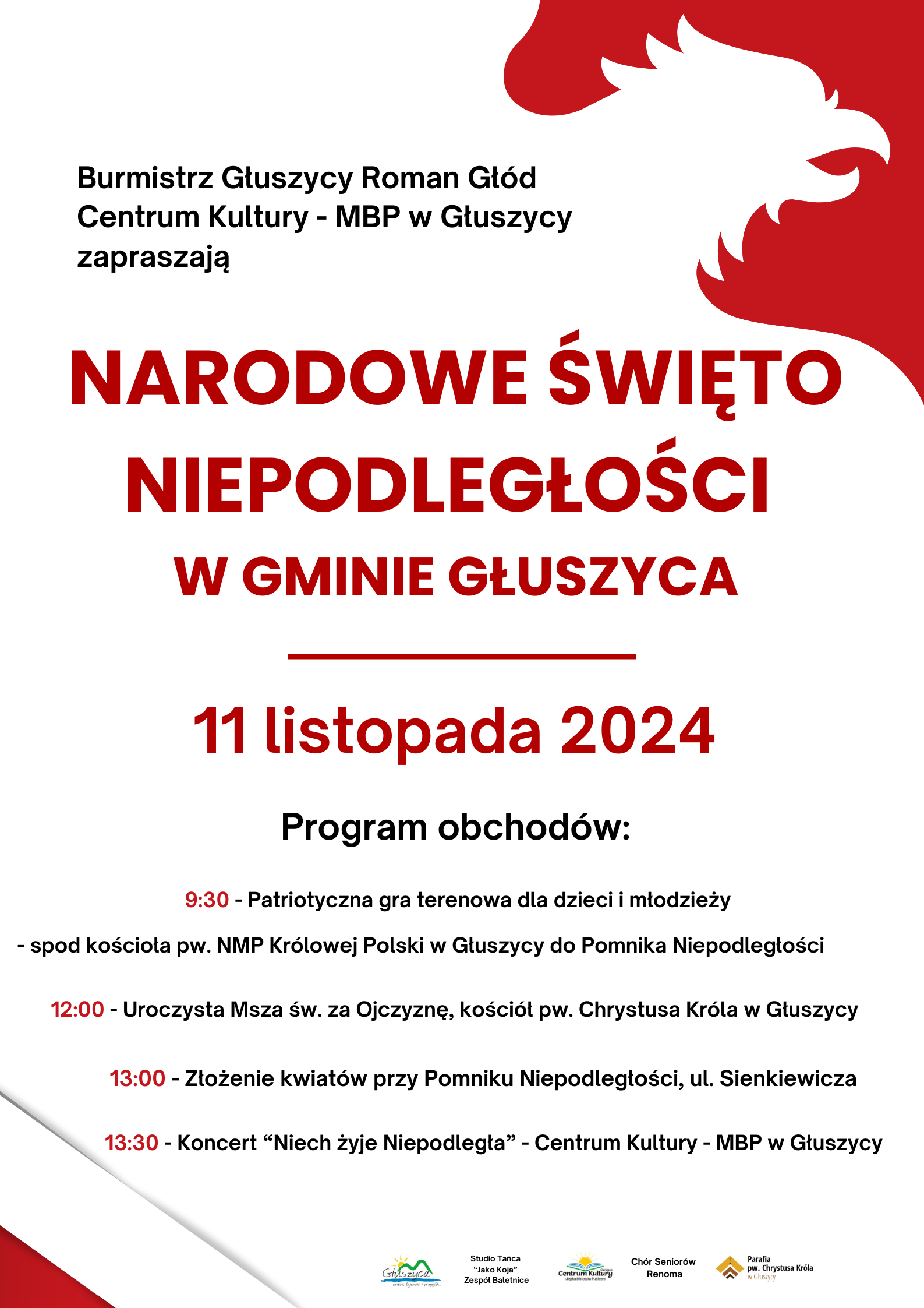 W tym roku będziemy przypada 106. Rocznica Odzyskania Niepodległości. W naszym mieście obchody rozpoczniemy patriotyczną grą terenową dla dzieci i młodzieży o godzinie 9:30 pod kościołem pw. NMP Królowej Polski w Głuszycy. O godz. 12:00 odbędzie się uroczysta Msza św. w intencji Ojczyzny w kościele pw. Chrystusa Króla. Po Mszy o godz. 13:00 przy Pomniku Niepodległości zostaną złożone kwiaty. O godz. 13:30 tradycyjnie już zapraszamy do Centrum Kultury – MBP w Głuszycy na część artystyczną pt. „Niech żyje Niepodległa”.