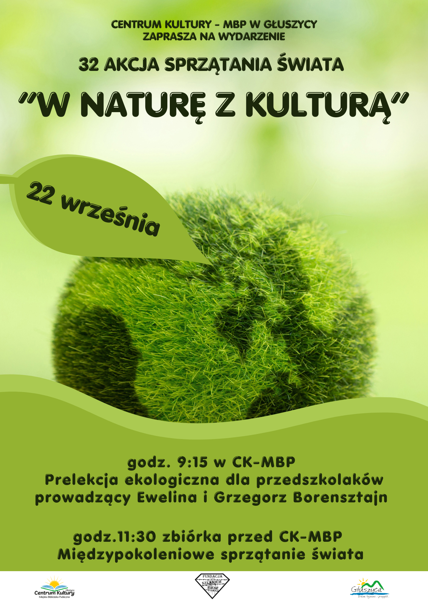 W poniedziałek 22 września dzieci z Przedszkola Samorządowego w Głuszycy wraz z Centrum Kultury - MBP w Głuszycy uczestniczyły w 32. Akcji Sprzątania Świata, której celem jest promowanie od najmłodszych lat zasad dbania o środowisko. Dzieci z ochotą i wielką radością włączyły się do akcji , chcąc jak najdokładniej posprzątać naszą Ziemię. Wspólne wydarzenie było