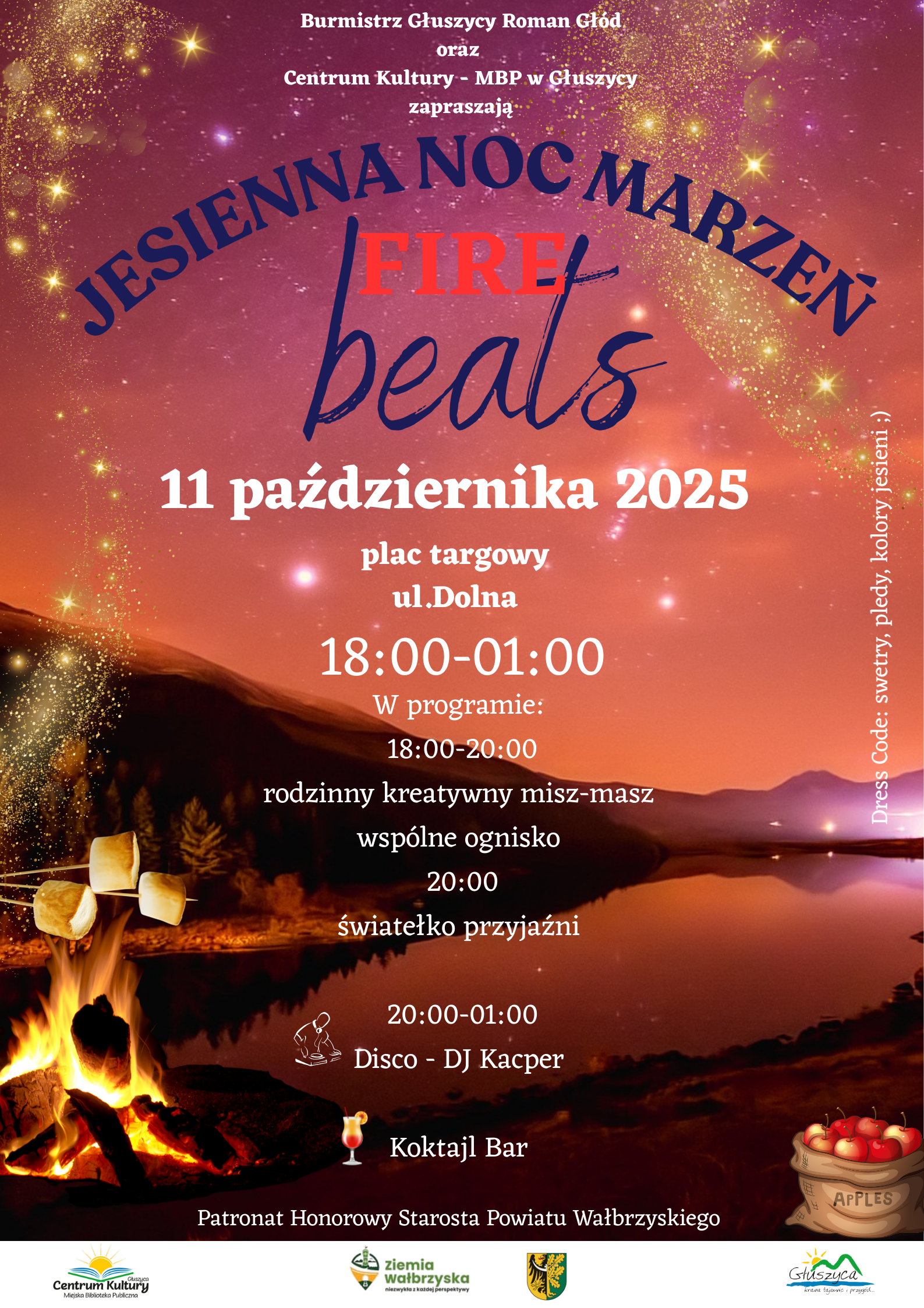 Halo, halo Głuszyca, czujecie jesienny vibe? My czujemy, dlatego przygotowaliśmy coś gorącego - Fire Beats – Jesienna Noc Marzeń.Będzie ognicho, na którym będzie można smażyć to co lubicie (kiełbaski, jabłka, pianki marshmallow - my zapewniamy ziemniaki i jabłka).O 18:00 rozpoczniemy rodzinnym tworzeniem jesiennych ozdób - puścimy wodzę fantazj. O godzinie 20:00 odpalamy zimne ognie i