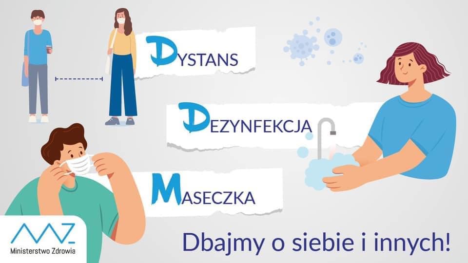 Przypominamy o dezynfekcji rąk po wejściu do budynku, zakryciu nosa i ust maseczką oraz zachowywaniu dystansu.