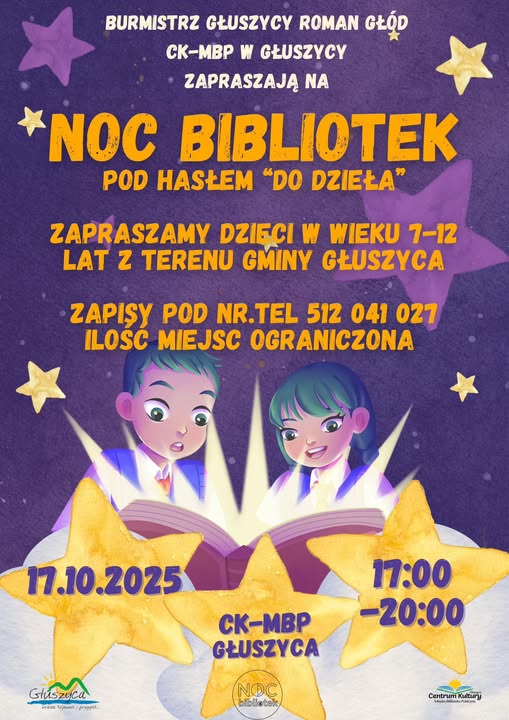 Najmłodsi książkoholicy! Przed Wami ulubiona impreza biblioteczna w roku - Noc Bibliotek ! Wspólne czytanie, zajęcia ruchowe i manualne to wszystko i jeszcze więcej już 17 października od godz.17-20. Od dzisiaj możecie się zapisywać pod nr tel.512 041 027. Mamy nadzieję, że ten wyjątkowy wieczór zostanie na długo w waszej pamięci! Temat przewodni to……… Dowiecie