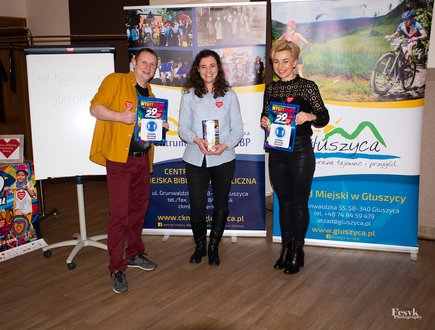 Gorące podziękowania przekazujemy również dla Pani Poseł Izabeli Katarzyny Mrzygłockiej, Łukasza Kazka, Anny Golemiec, Leny Stępień, Ryszarda Berczyńskiego za przedmioty przekazane do licytacji. Jeszcze raz dziękujemy Magdalenie Kandefer za sympatyczną obsługę telefoniczną w czasie licytacji i hojność osób biorących udział w licytacjach. Podziękowania dla Pawła Fesyka za przekazanie na licytację profesjonalnej sesji fotograficznej oraz wykonanie zdjęć podczas finału. Podziękowania za wsparcie organizacyjne dla Krzysztofa Gołdy oraz Artura Gołdy, który wraz z dyrektor CK-MBP Sabiną Jelewską poprowadził głuszycki finał. Serdeczne podziękowania dla funkcjonariuszy Komisariatu Policji w Głuszycy, którzy czuwali nad bezpieczeństwem 29. Finału WOŚP. Dziękujemy wszystkim za przekazane wpłaty i otwarte serca! Dziękujemy za łączność internetową i telefoniczną, za każdy ciepły gest i okazane wsparcie w tym trudnym dla nas wszystkich czasie pandemii.