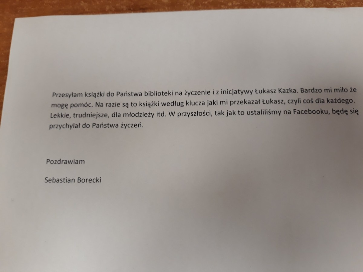 W wyniku akcji podjętej przez Radnego Powiatu Wałbrzyskiego pana Łukasza Kazka, polegającej na objęciu mecenatem biblioteki w rodzinnej miejscowości Walim, zgłosiły się do Niego osoby, które chcą wspomagać pozostałe biblioteki w powiecie. Grupa ośmiu darczyńców będzie co kwartał kupować dla wybranej biblioteki po trzy książkowe nowości wydawnicze. Akcja potrwa przez okres pięciu lat. Mecenasem głuszyckiej biblioteki jest Pan Sebastian Borecki, architekt z Gliwic, miłośnik Gór Sowich, administrator strony internetowej „Zabytki Dolnego Śląska”. Pierwsze książki od pana Sebastiana już trafiły do biblioteki. Dziękujemy!