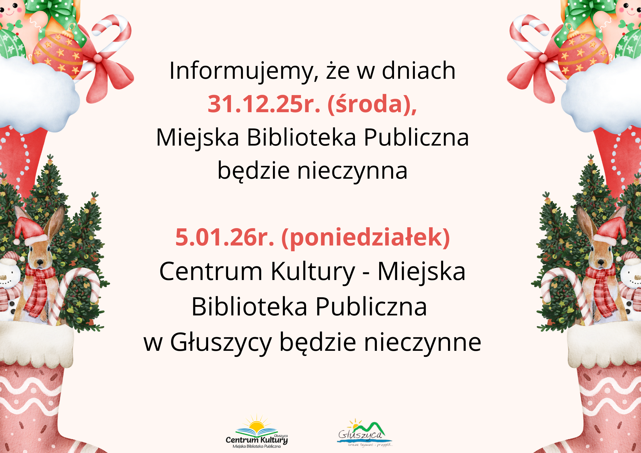 Drodzy sympatycy, czytelnicy i odwiedzający nas informujemy, że 31 grudnia 2025 – biblioteka będzie nieczynna, a 5 stycznia 2026 – cała instytucja Centrum Kultury – MBP w Głuszycy.