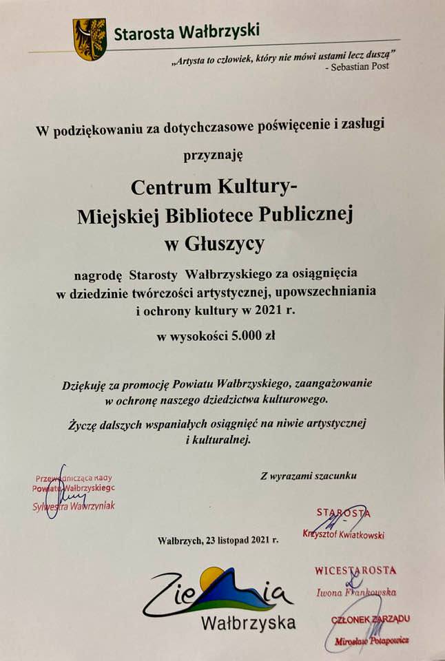 Miło nam poinformować, że Centrum Kultury-Miejska Biblioteka Publiczna w Głuszycy otrzymało w nagrodę Starosty Wałbrzyskiego za osiągnięcia w dziedzinie twórczości artystycznej, upowszechniania i ochrony kultury w 2021 r. w kategorii zbiorowej.