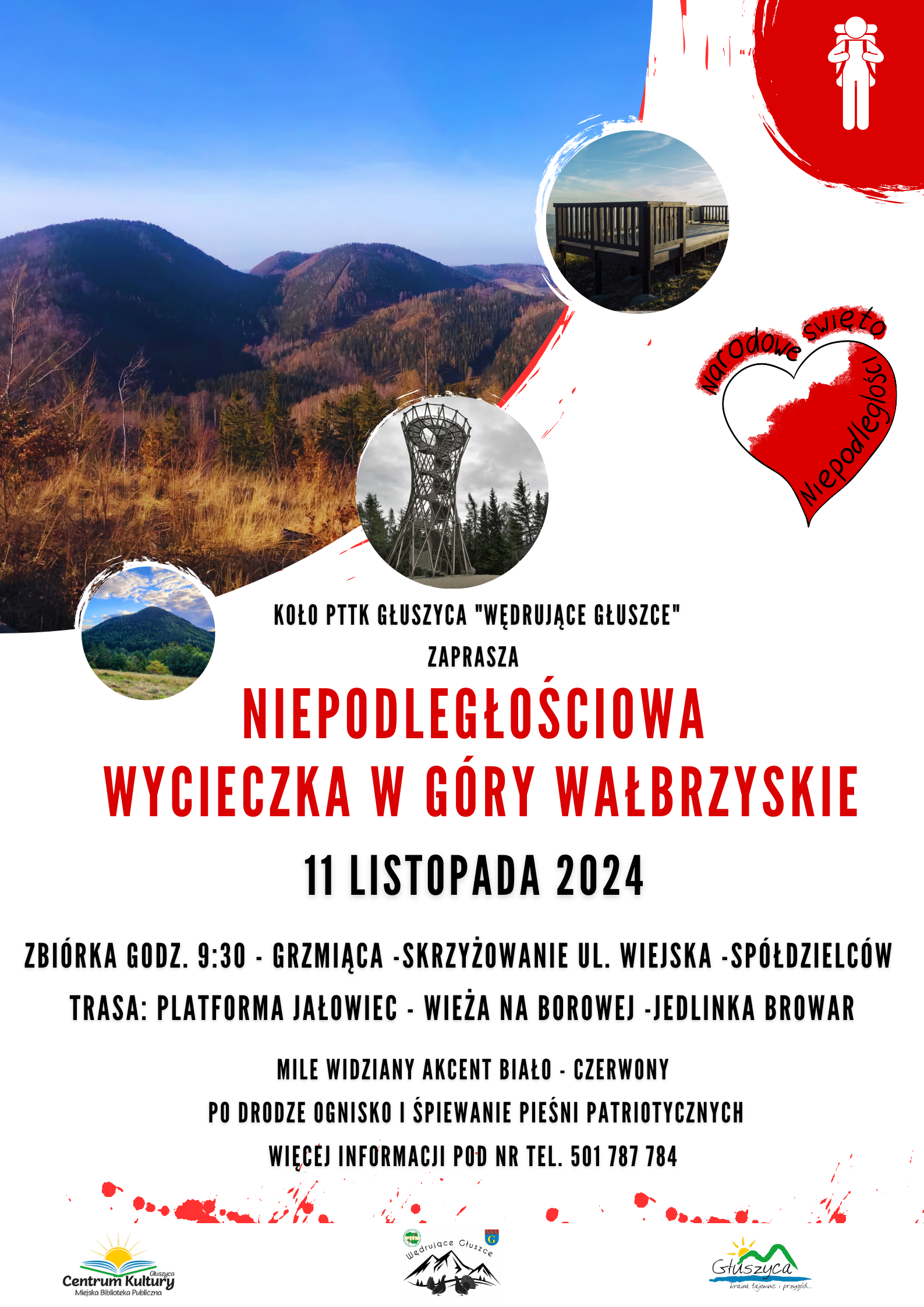Koło PTTK Głuszyca „Wędrujące Głusze” serdecznie zaprasza wszystkich mieszkańców oraz turystów na wyjątkową Niepodległościową Wycieczkę w Góry Wałbrzyskie, która odbędzie się 11 listopada 2024 roku. Wydarzenie to organizowane jest w ramach obchodów Narodowego Święta Niepodległości.