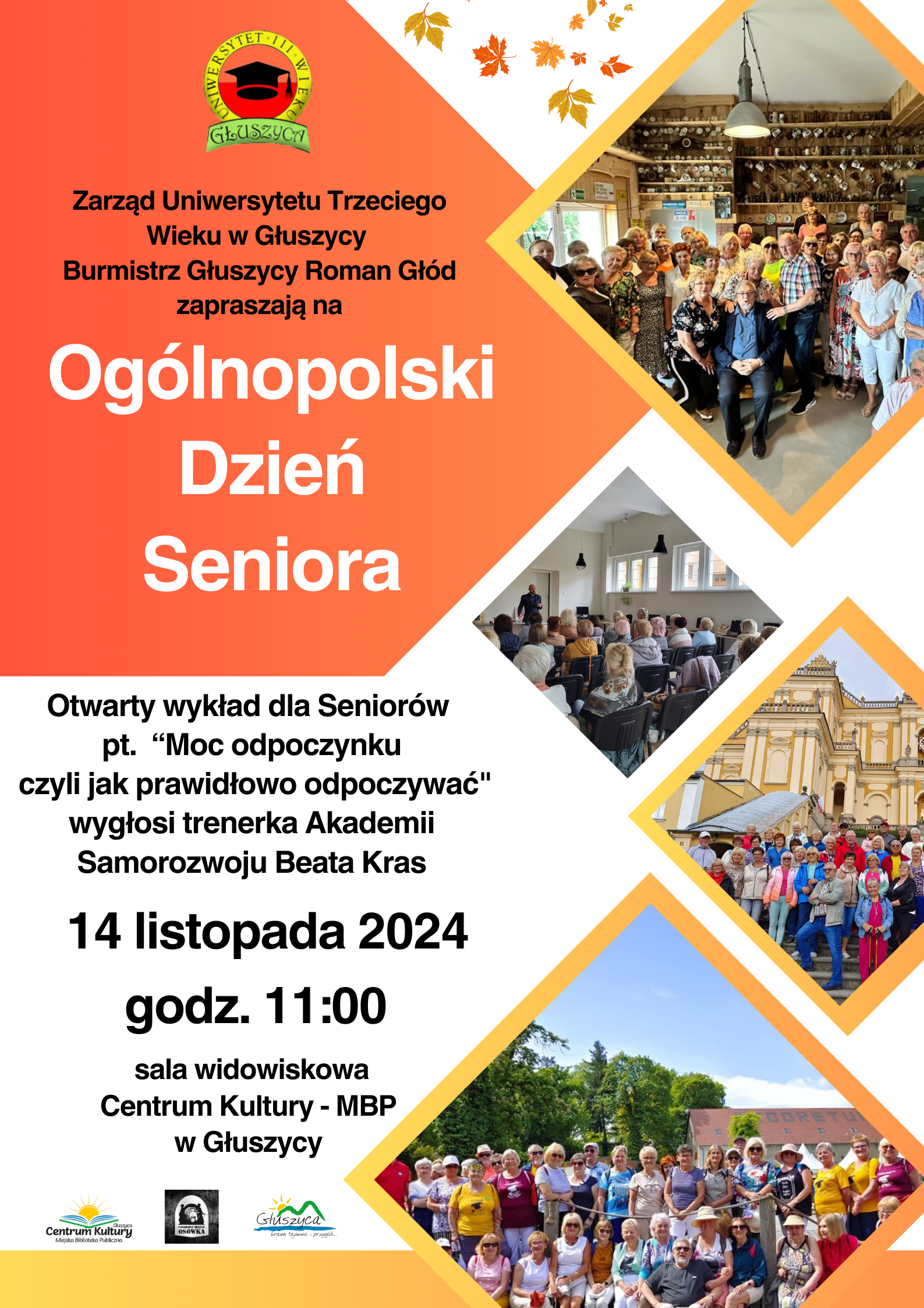 14 listopada to Światowy Dzień Seniora. Z tej okazji Burmistrz Głuszycy Roman Głód, Zarząd Uniwersytetu Trzeciego Wieku w Głuszycy oraz Centrum Kultury – MBP w Głuszycy zapraszają Seniorów do wspólnego i radosnego świętowania.