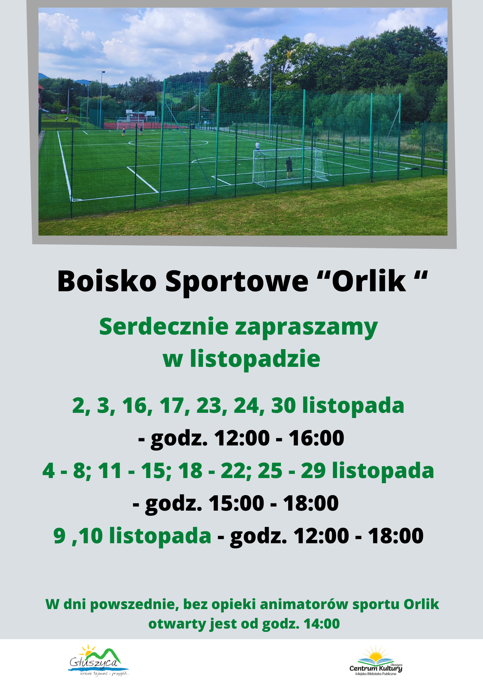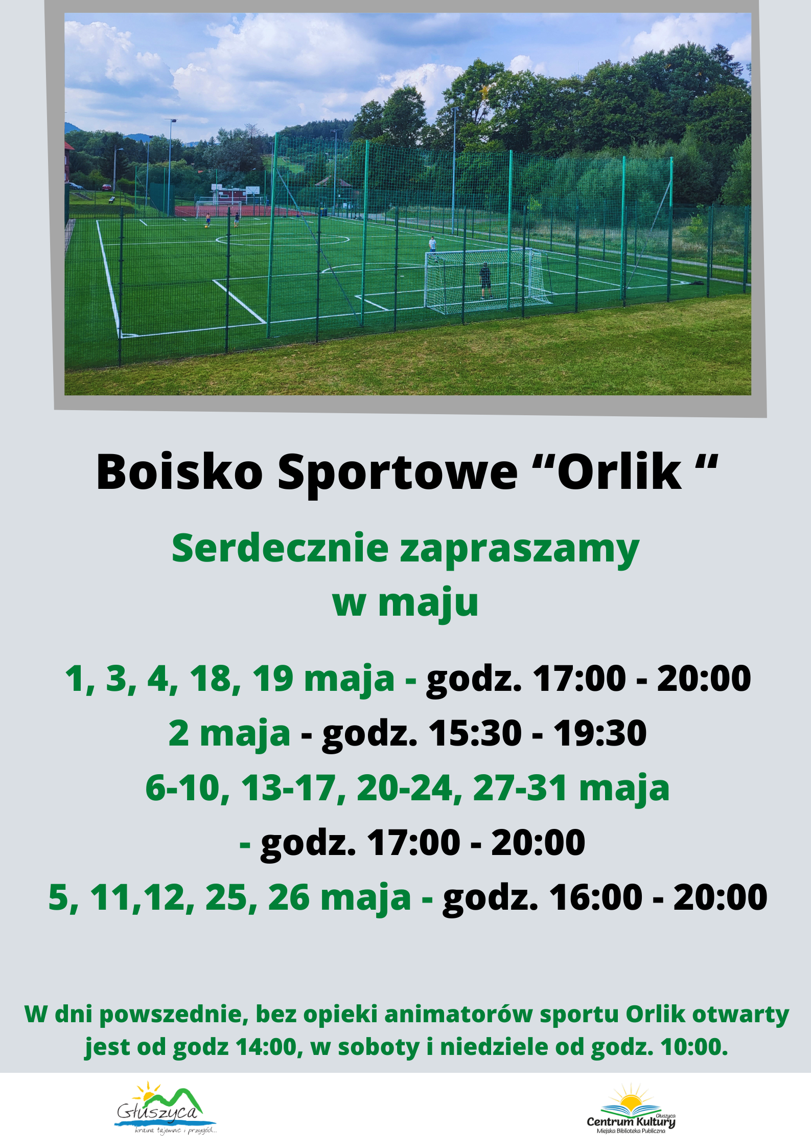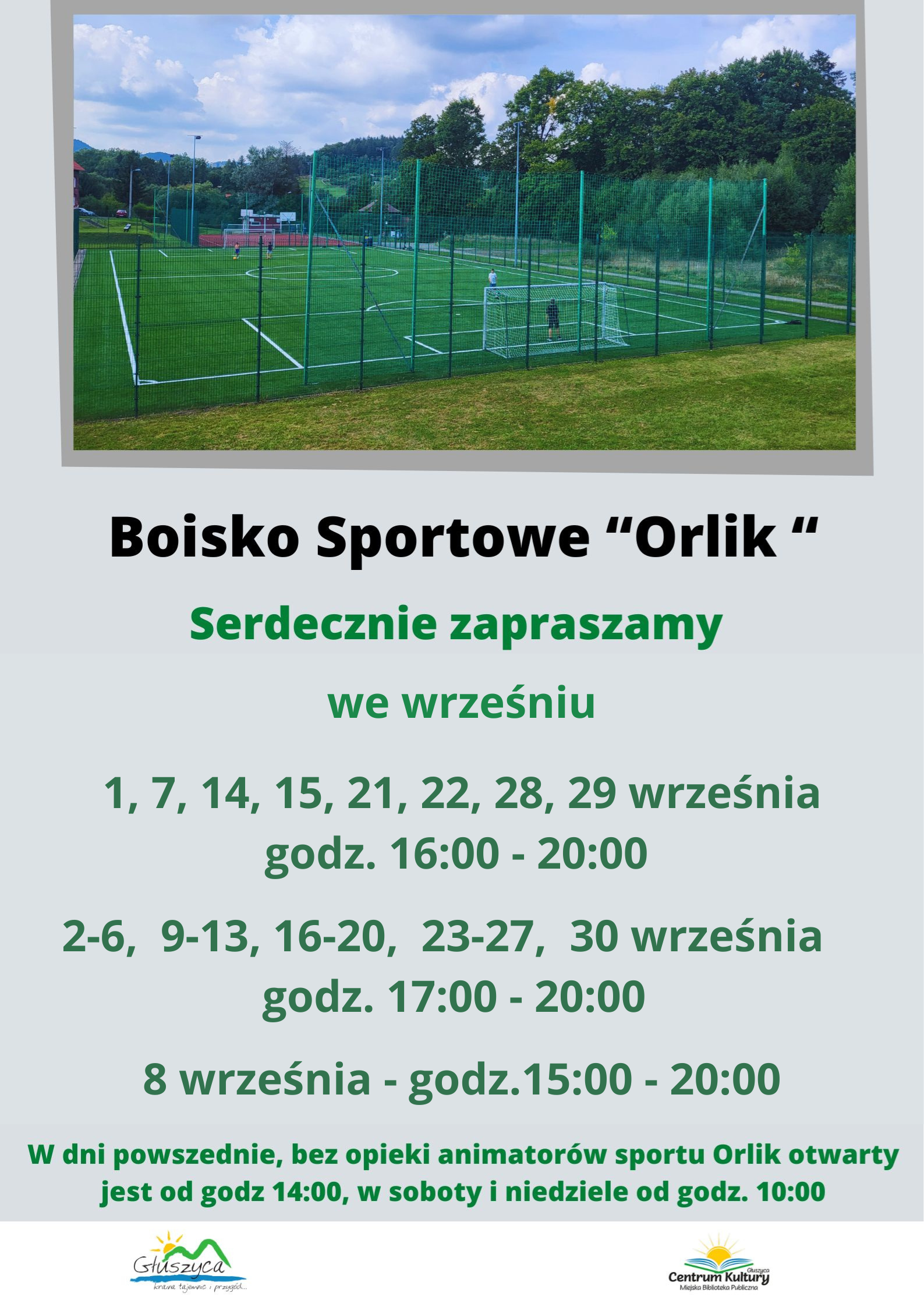 Zapraszamy do korzystania z kompleksu boisk Orlik w Głuszycy. Prosimy o zapoznanie się z godzinami otwarcia, regulaminem obiektu i obowiązującymi zasadami sanitarnymi.