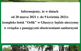 Informujemy, że w dniach od 20 marca 2021 r. do 9 kwietnia 2021r. kompleks boisk "Orlik" w Głuszycy będzie nieczynny w związku z panującymi obostrzeniami sanitarnymi.