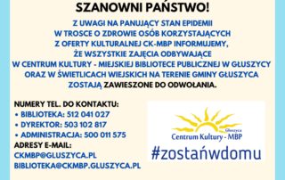 Szanowni Państwo! Z uwagi na panujący stan epidemii w trosce o zdrowie osób korzystających z oferty kulturalnej CK-MBP informuję, że wszystkie zajęcia odbywające w Centrum Kultury – Miejskiej Bibliotece Publicznej