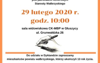 Z okazji Międzynarodowego Dnia Języka Ojczystego Centrum Kultury-Miejska Biblioteka Publiczna w Głuszycy ogłasza VIII Dyktando Miejskie w Głuszycy. Honorowy patronat nad wydarzeniem objął Starosta Wałbrzyski. Tekst tegorocznego dyktanda przygotowała legnicka
