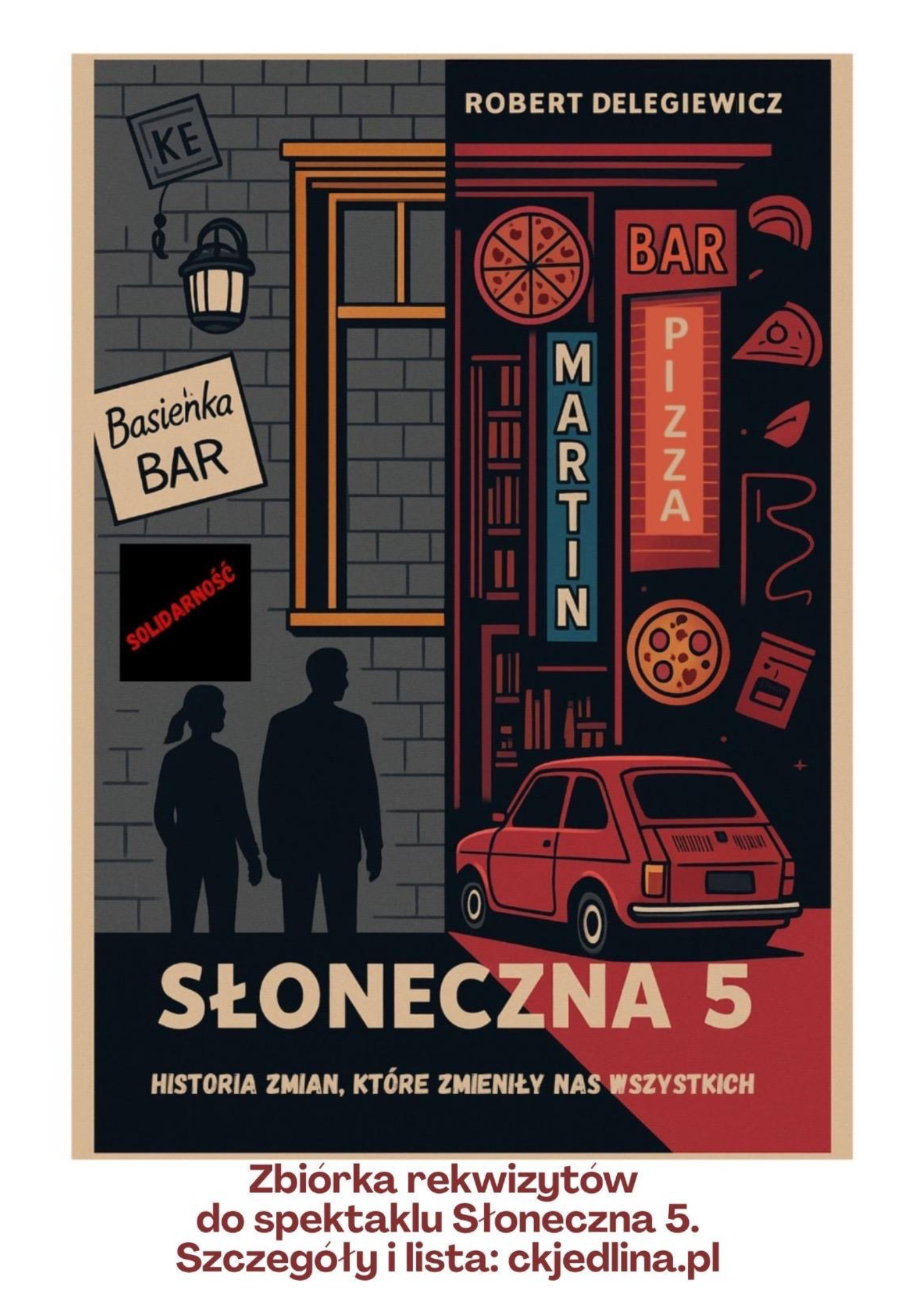 Trwają próby i gorące przygotowania do spektaklu teatralnego „Słoneczna 5” w reżyserii Roberta Delegiewicza. Spektakl powstaje we współpracy Centrum Kultury w Jedlinie-Zdroju, Centrum Kultury-Miejskiej Biblioteki Publicznej w Głuszycy i Fundacji Pałac Jedlinka. Akcja sztuki umiejscowiona jest w latach 90-tych. Poniżej zamieszczamy listę potrzebnych przedmiotów. Bardzo prosimy o pomoc w zbiórce rekwizytów w formie bezpłatnego przekazania lub użyczenia.