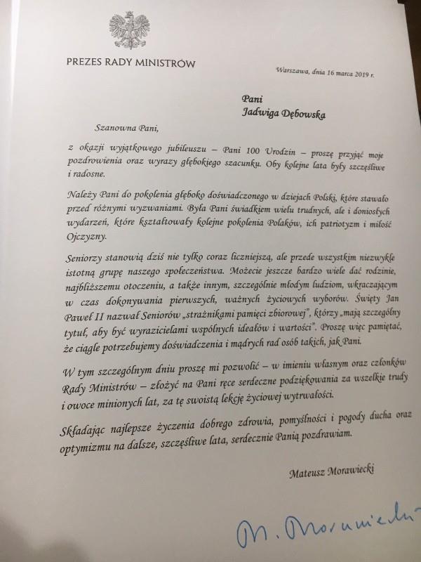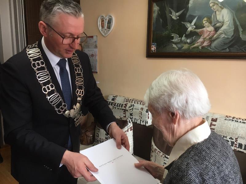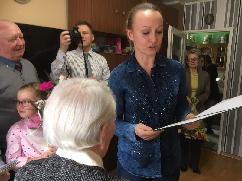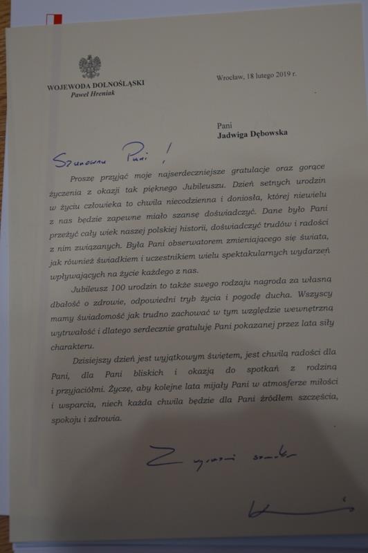 W przededniu setnej rocznicy urodzin Burmistrz Głuszycy Roman Głód złożył najserdeczniejsze życzenia Pani Jadwidze Dębowskiej – najstarszej Mieszkance Głuszycy – babci naszej Pani Dorotki Link. Burmistrz przekazał na ręce Szanownej Jubilatki listy gratulacyjne przesłane przez Prezesa Rady Ministrów Mateusza Morawieckiego i Wojewodę Dolnośląskiego Pawła Hreniaka. W uroczystym spotkaniu uczestniczyły także pracownice Zakładu Ubezpieczeń Społecznych w Wałbrzychu, Sekretarz Gminy i Kierownik Urzędu Stanu Cywilnego w Głuszycy Wiesława Moździerz, dyrektor CK-MBP w Głuszycy Sabina Jelewska oraz licznie zgromadzona najbliższa rodzina Jubilatki.
