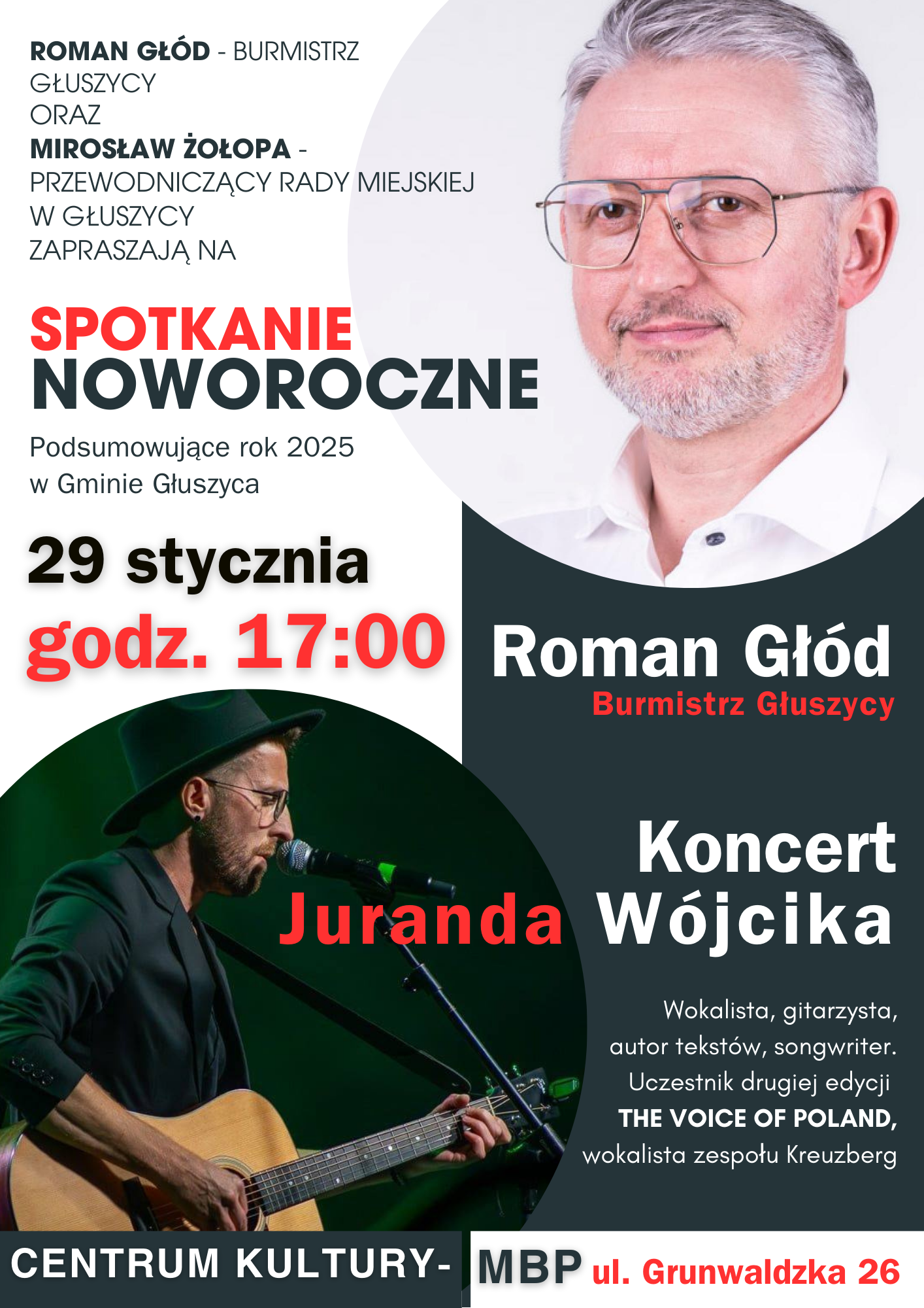 Serdecznie zapraszamy na spotkanie noworoczne Burmistrza Głuszycy Romana Głoda podsumowujące rok 2025 w czwartek o godz. 17:00