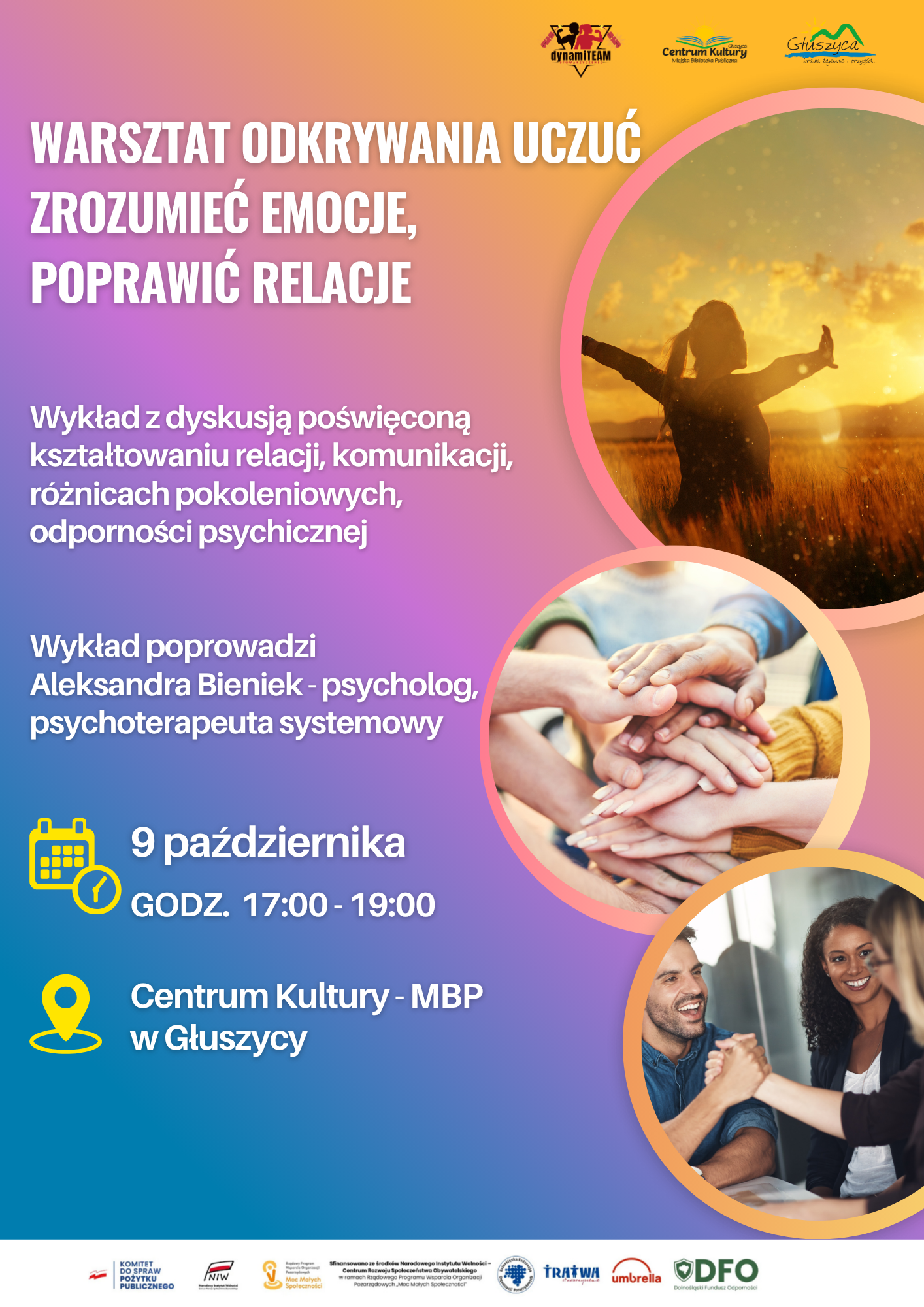 Zapraszamy wszystkich mieszkańców Głuszycy na bezpłatne spotkanie z psychologiem Aleksandrą Bieniek, które odbędzie się w czwartek 9 PAŹDZIERNIKA w Centrum Kultury – MBP w Głuszycy. Podczas spotkania przewidziano również sesję pytań, gdzie każdy z uczestników będzie mógł zadać pytanie na nurtujące go zagadnienia.