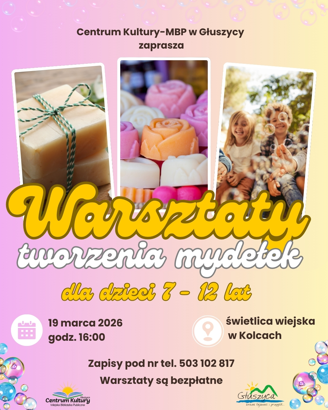 Zapraszamy serdecznie dzieci w wieku 7- 12 lat na warsztaty tworzenia mydełek do świetlicy wiejskiej w Kolcach!