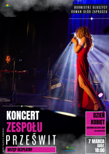 7 marca to coś dla melomanów o godzinie 18:00 zapraszamy na wyjątkowy koncert. Kto był u nas na WOŚPIE to wie, jaką przygotowaliśmy ucztę muzyczną. Kto nie był, ma szansę poznać talent i charyzmę naszych gości, którzy wystąpią tym razem w duecie ze swoimi autorskimi utworami jak również znanymi i cenionymi coverami . Zapraszamy na występ zespołu „Prześwit”. Nie będziemy się rozpisywać, po prostu to trzeba usłyszeć i poczuć.