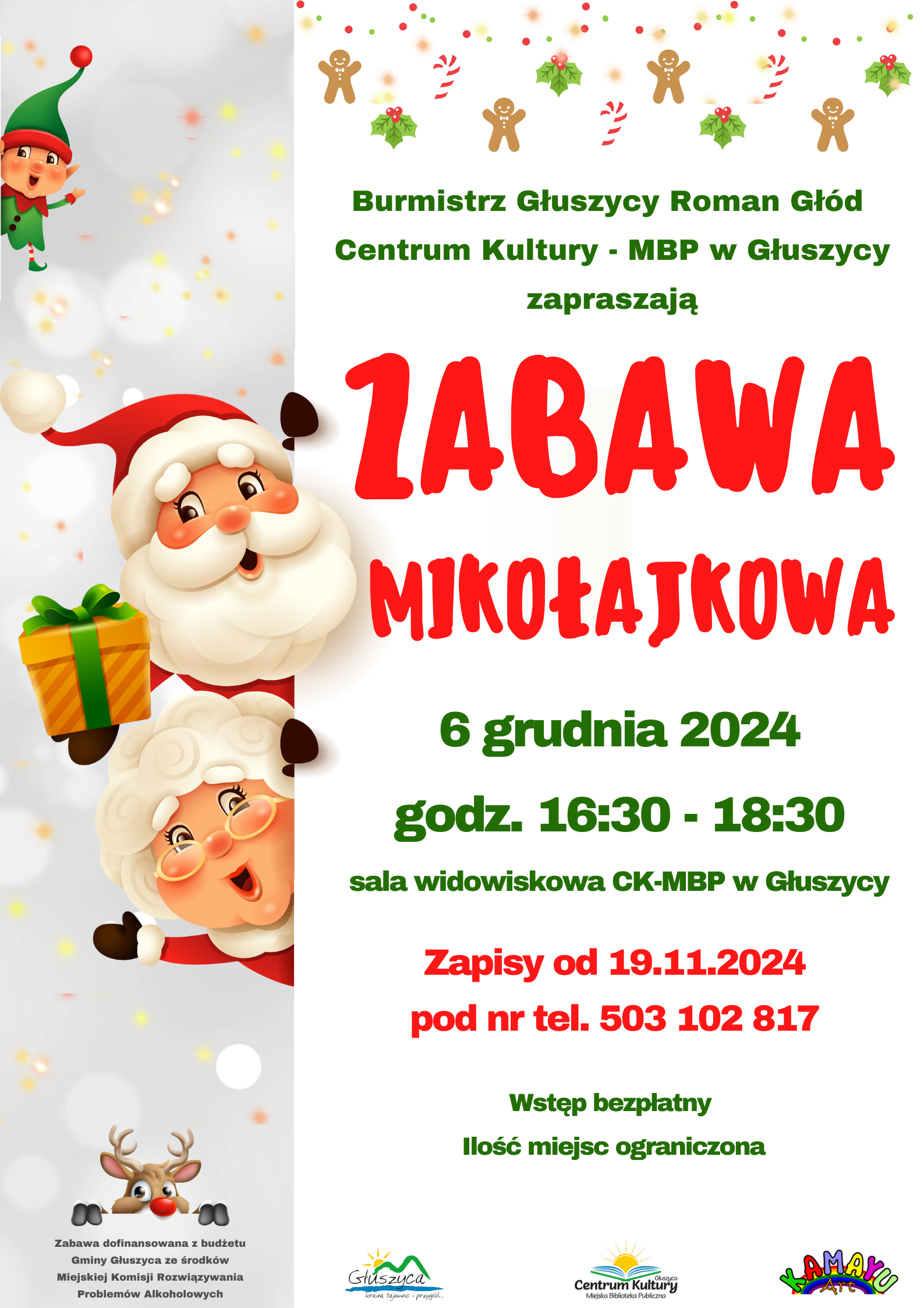 Serdecznie zapraszamy wraz z Burmistrzem Głuszycy Romanem Głodem na Zabawę Mikołajkową, która odbędzie się 6 grudnia 2024 od godz. 16:30 do 18:30 w Centrum Kultury – MBP w Głuszycy.