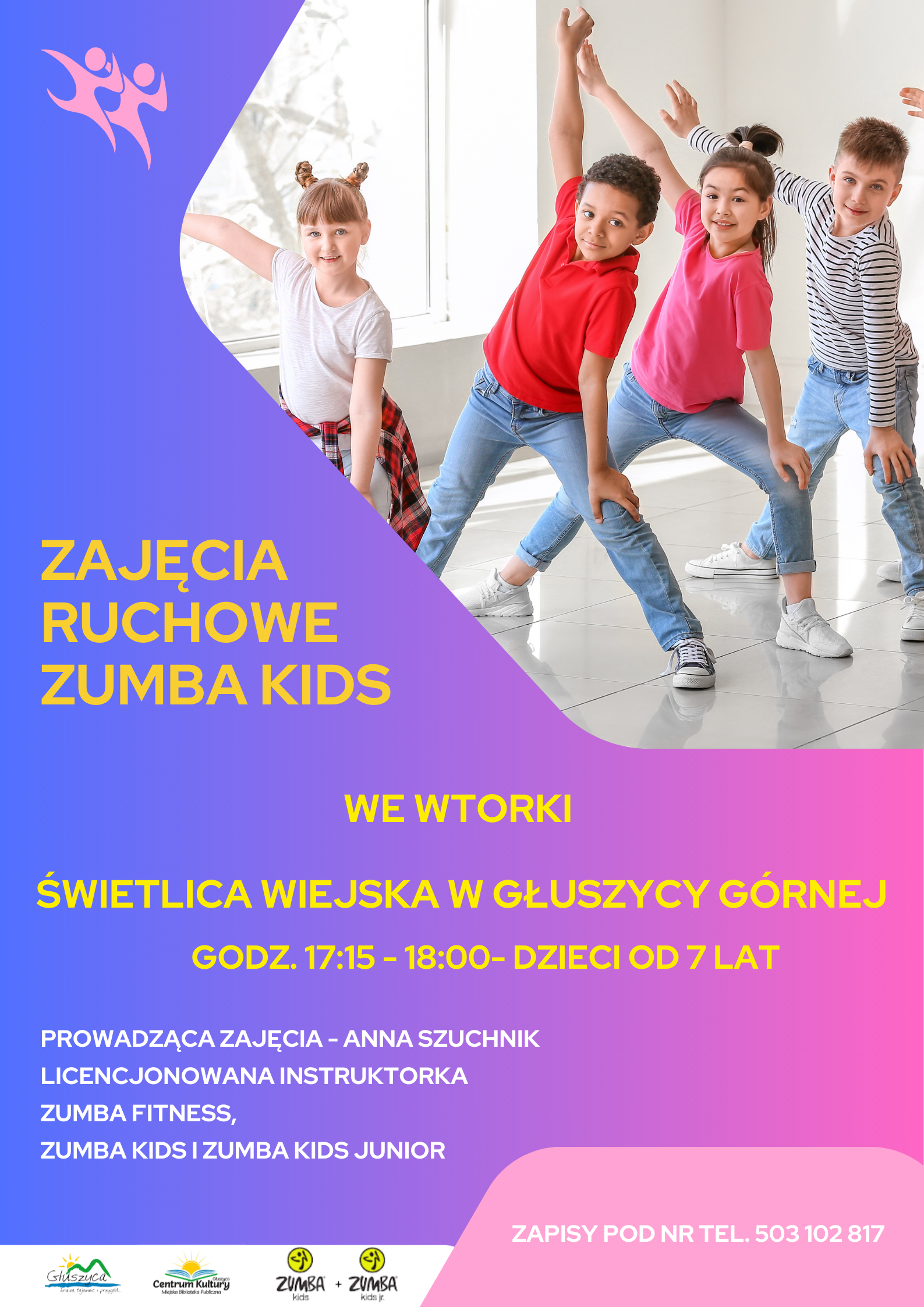 Zapraszamy dzieci od 7 roku życia na bezpłatne zajęcia Zumby Kids w świetlicy wiejskiej w Głuszycy Górnej w każdy wtorek o godz. 17:15.